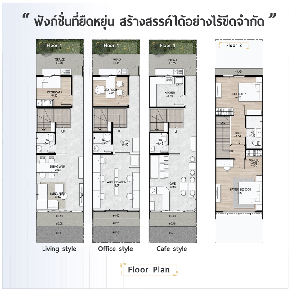 จากแปลนชั้น 1 ที่เน้น "ฟังก์ชันที่ยืดหยุ่น" คุณจะพบกับพื้นที่ที่เปิดกว้างและไร้ขีดจำกัด ไม่ว่าความฝันของคุณคือการทำร้านกาแฟ (Cafe Style) ที่มีบรรยากาศอบอุ่น, ออฟฟิศยุคใหม่ (Office Style) ที่ดูโปร่งสบาย หรือสตูดิโอถ่ายภาพสุดชิค พื้นที่นี้สามารถปรับเปลี่ยนได้ตามไลฟ์สไตล์ธุรกิจของคุณอย่างง่ายดาย ในขณะที่ชั้น 2 ถูกจัดสรรให้เป็นพื้นที่ทำงานส่วนตัวหรือห้องประชุมที่กว้างขวาง มอบความสะดวกสบายและการจัดการที่ลงตัวในที่เดียวโดยไม่ต้องต่อเติมให้ยุ่งยาก